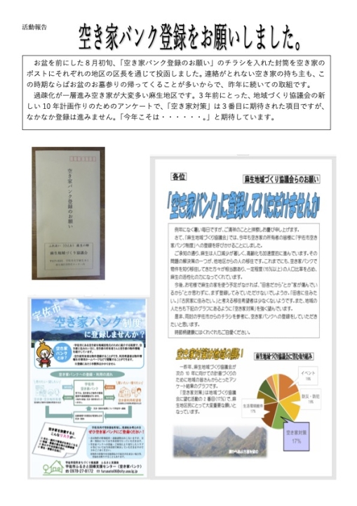 お盆を前にした8月初旬、「空き家バンク登録のお願い」のチラシを入れた封筒を空き家のポストにそれぞれの地区の区長を通じて投函しました。連絡がとれない空き家の持ち主も、この時期ならばお盆のお墓参りの帰ってくることが多いからで、昨年に続いての取組です。