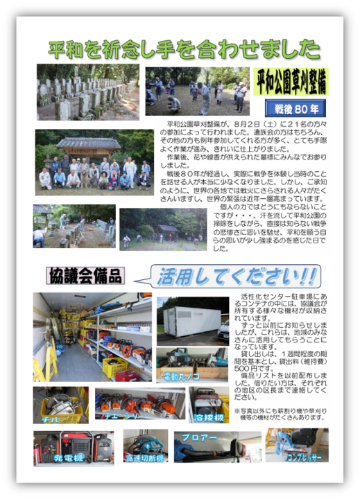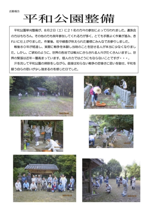 平和公園草刈整備が、8月2日(土)に21名の方々の参加によって行われました。遺族会の方はもちろん、その他の方も例年参加してくれる方が多く、とても手際よく作業が進み、きれいに仕上がりました。作業後、花や線香が供えられた墓標にみんなでお参りしました。