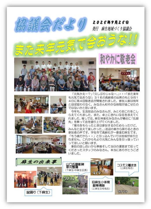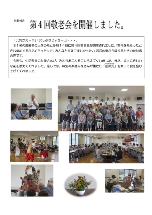 31名の高齢者の出席のもと9月14日に第4回敬老会が開催されました。「案内をもらったときは参加するかためらったけど、みんなと会えて楽しかった。」送迎の車から降りるときの参加者の声です。
