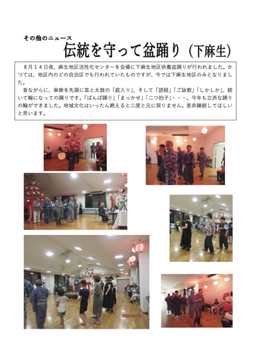 8月14日夜、麻生地区活性化センターを会場に下麻生地区供養盆踊りが行われました。かつては、地区内のどの自治区でも行われていたものですが、今では下麻生地区のみとなりました。